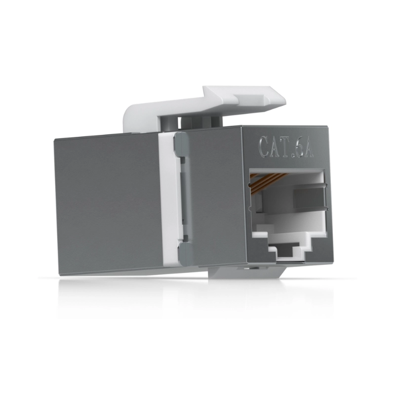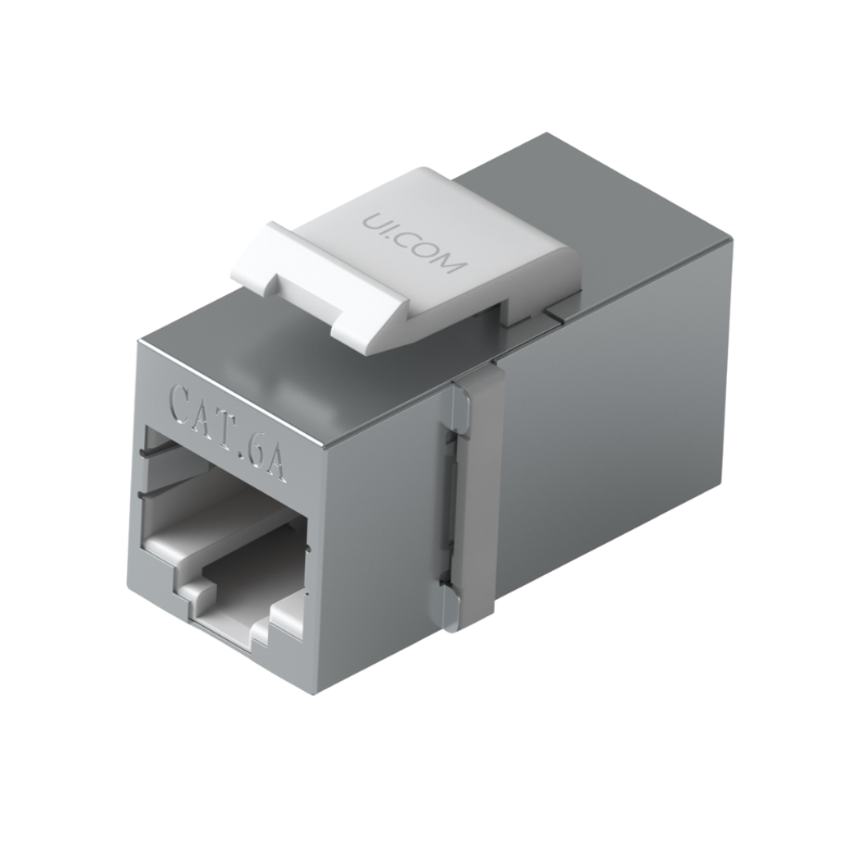 Pass-through Cat6A keystone coupler for connecting pre-terminated Ethernet cables seamlessly.