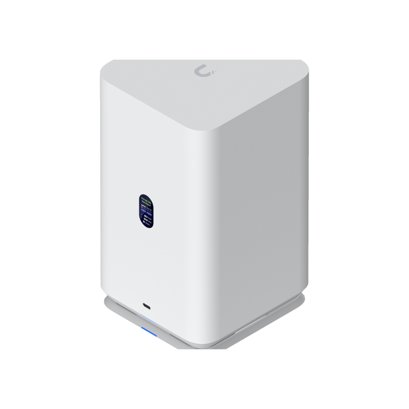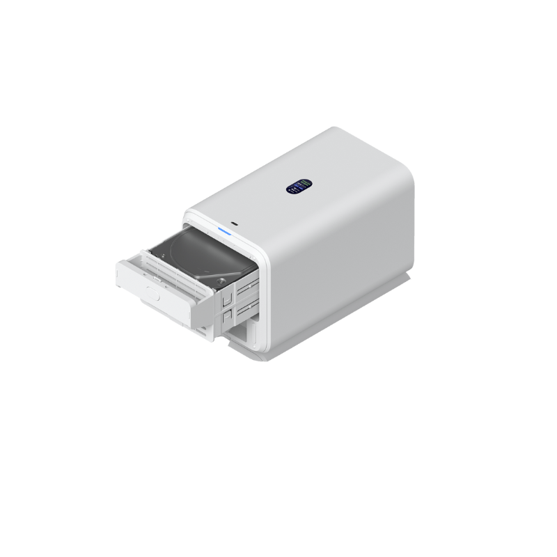 UniFi Network Attached Storage with (2) 3.5″ HDD bays, 2.5 GbE networking, USB-C connectivity, and an included PoE++ adapter, all in a compact footprint.